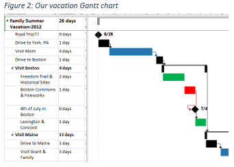 Here’s a quick example. Several summers ago, my family and I piled into our minivan, left the heat of South Carolina, and headed to New England for a much-anticipated vacation. So, being the consummate project manager, I drew up the Gantt chart. (You can probably see my wife’s eyes rolling. Can’t you?)
