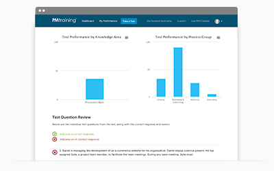 Quickly understand what CAPM study areas require more focus before you take the real exam. Each time you take a test, the system will track your performance by Knowledge Area, Domain, and more.
