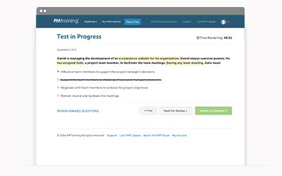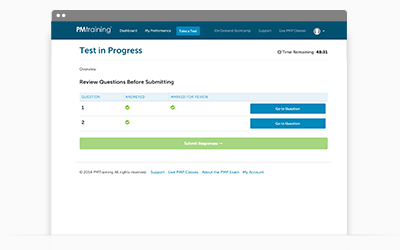 Mark your responses for review later, return to any CAPM test question before getting results, and take the test using the same time limits as the real exam.