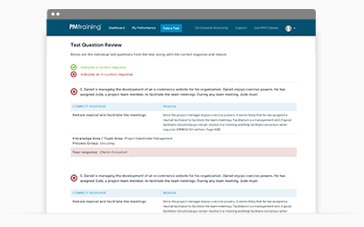 Use PMTraining's reports to review your performance by PMBOK® Guide Knowledge Area, CAPM Domain, scoring trends over time, and detailed analysis of past test results.